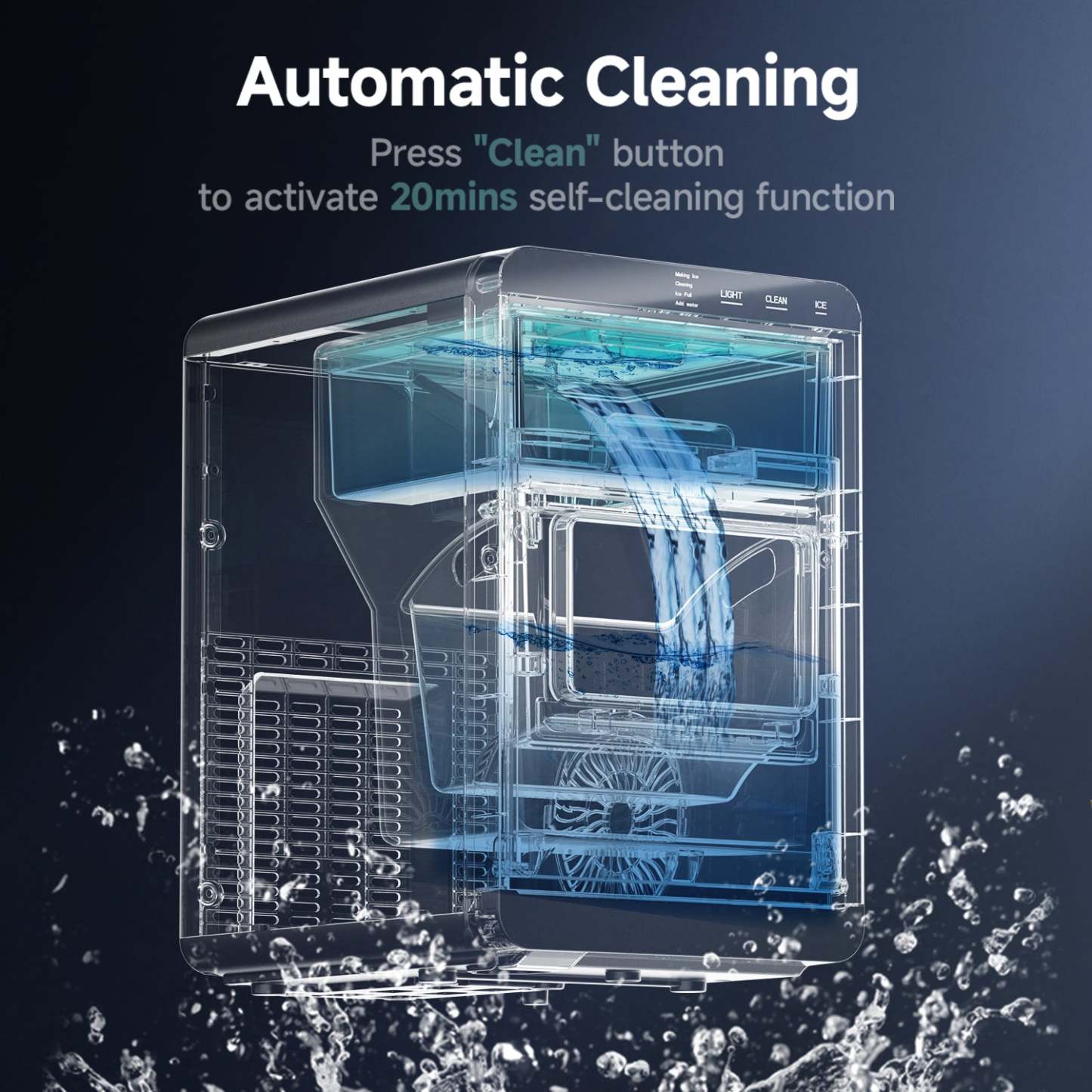 - 【Automatic Cleaning】: Thanks to the automatic cleaning system built into the nugget countertop ice maker, you can easily skip the procedure of scrubbing, press the "CLEAN" button, and the cleaning program of the pebble ice maker will be activated and run for about 20Mins, no more tedious manual cleaning with the self-cleaning function.